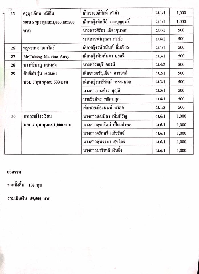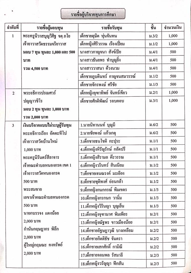 โรงเรียนหนองกรดพิทยาคม ขอขอบพระคุณผู้มีจิตศรัทธา ผู้บริหาร คณะครูและบุคลากรทางการศึกษาทุกท่าน ที่ได้มอบทุนการศึกษาให้แก่นักเรียน เนื่องในวันไหว้ครูประจำปีการศึกษา 2560 ยอดรวมทั้งสิ้น 105 ทุน รวมเป็นเงิน 59,500 บาทถ้วน