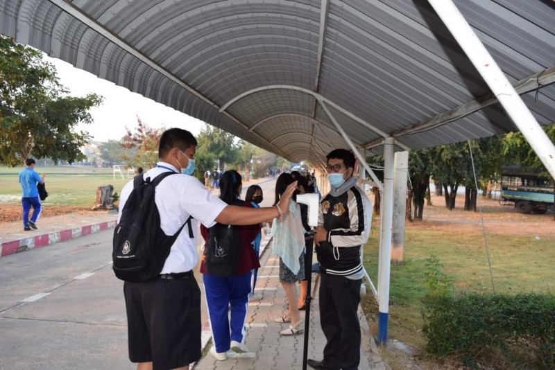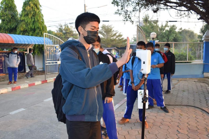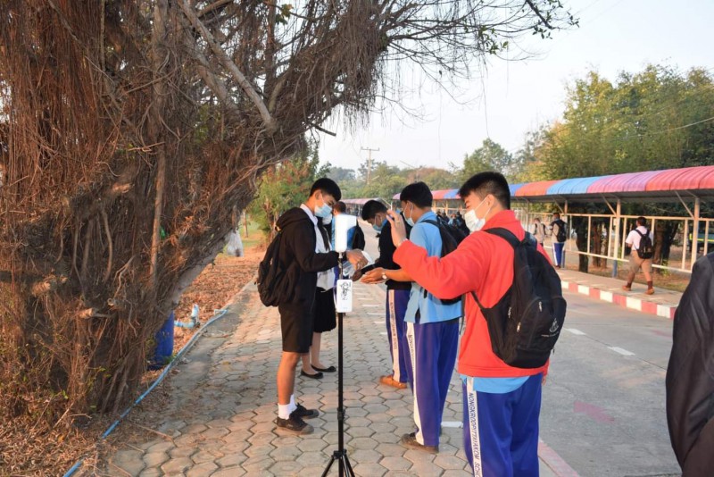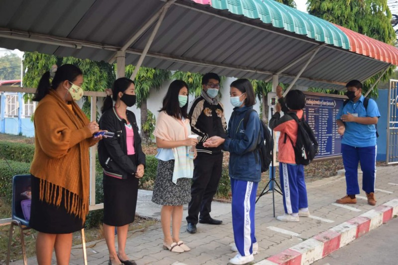ครูเวรประจำวัน ตรวจวัดอุณหภูมิร่างกายและฉีดแอลกอฮอล์ ให้กับนักเรียนก่อนเข้าโรงเรียน ตามมาตรการป้องกันโรค COVID-19