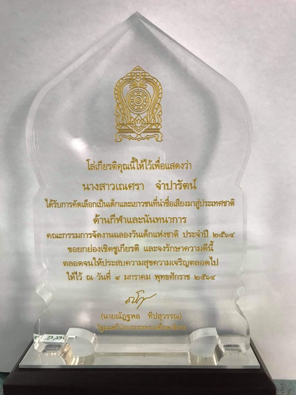 ร่วมแสดงความยินดีกับนางสาวเณศรา จำปารัตน์ ที่ได้รับการคัดเลือกเป็นเด็กและเยาวชนที่นำชื่อเสียงมาสู่ประเทศชาติ ด้านกีฬาและนันทนาการ เนื่องในวันเด็กแห่งชาติ ประจำปี ๒๕๖๔